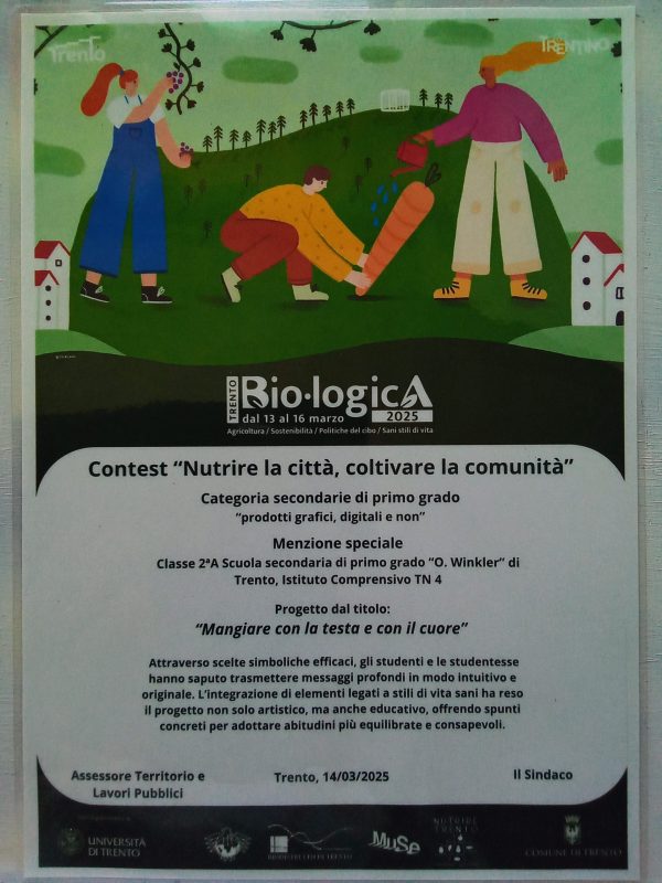Gli alunni della classe 2°A, a seguito dell’intervento in classe di un’esperta in tema di alimentazione e agli approfondimenti svolti durante le lezioni di Cittadinanza con le docenti di Italiano e Scienze, hanno partecipato della contest “Nutrire la città, coltivare la comunità” promosso dal Comune di Trento.