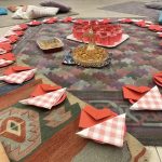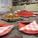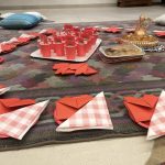 Da qui è nata l’idea di creare un’esperienza concreta di accoglienza e condivisione. Qualche giorno fa, in occasione della distribuzione delle schede, con la presenza dei genitori, l’aula si è trasformata in uno spazio raccolto e significativo: tappeti a terra, cuscini disposti in cerchio, un grande allestimento centrale con tazze rosse pronte per una tisana ai frutti rossi, dolcetti preparati con cura e un elegante servizio per il tè. Intorno, piattini con tovaglioli e piccoli cuori di carta rossa piegati a mano, ognuno con un messaggio per gli ospiti.